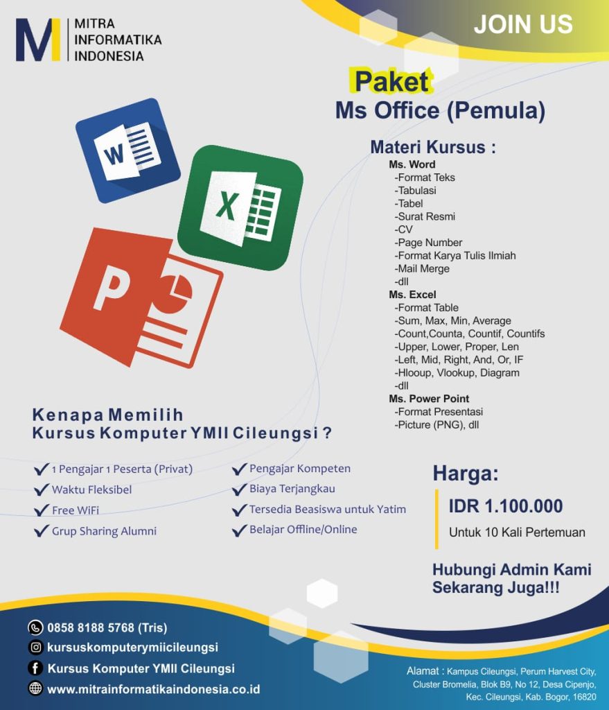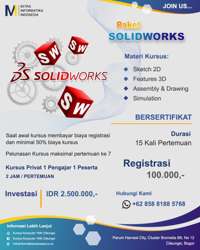 Paket belajar komputer kami dari pemula Ms Office, ada juga Desain Grafis, Video Editing, Jaringan Komputer, Web Desain, Web Programming, Digital Marketing, AutoCAD, SolidWorks, SketchUp, dll