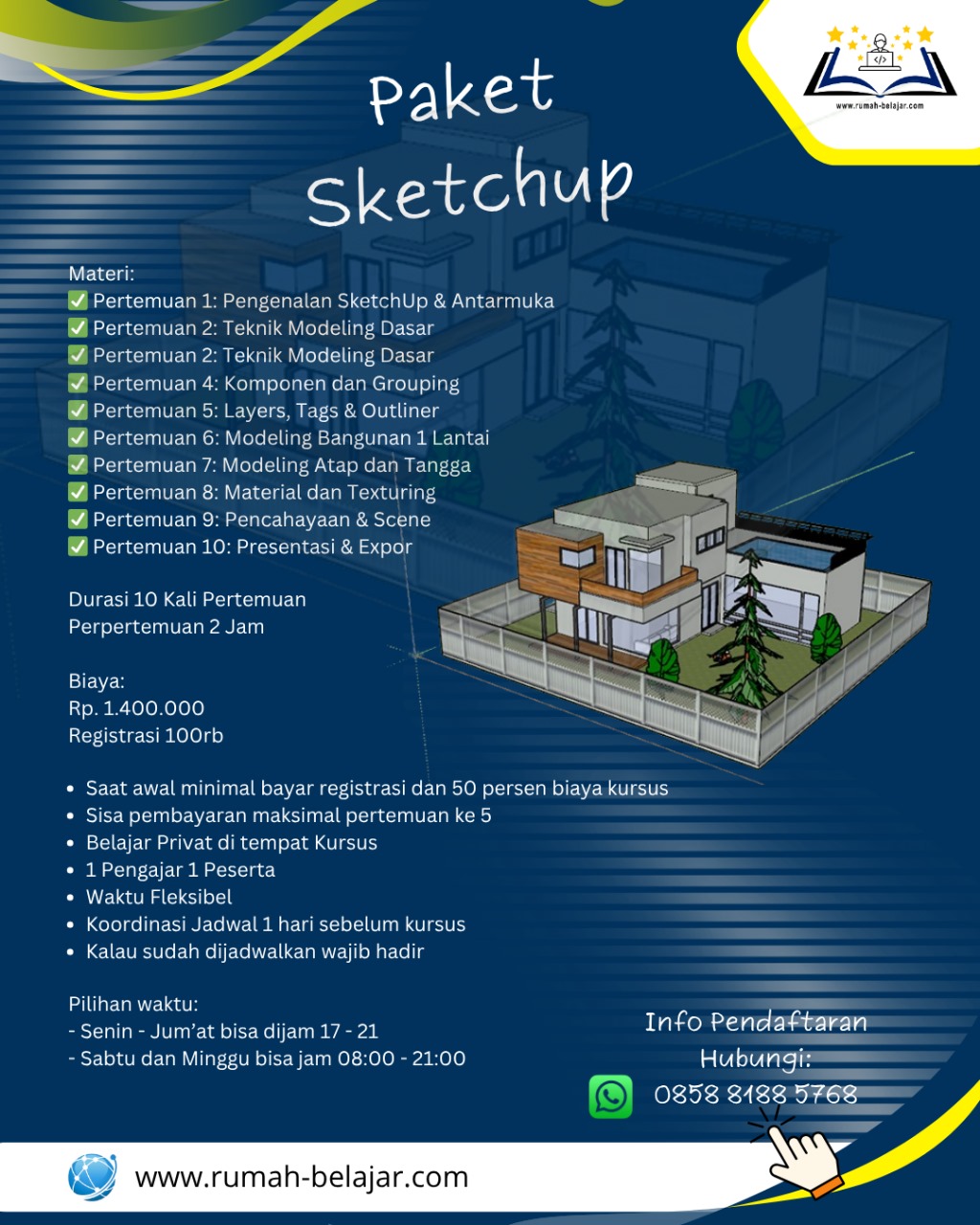 Paket belajar komputer kami dari pemula Ms Office, ada juga Desain Grafis, Video Editing, Jaringan Komputer, Web Desain, Web Programming, Digital Marketing, AutoCAD, SolidWorks, SketchUp, dll